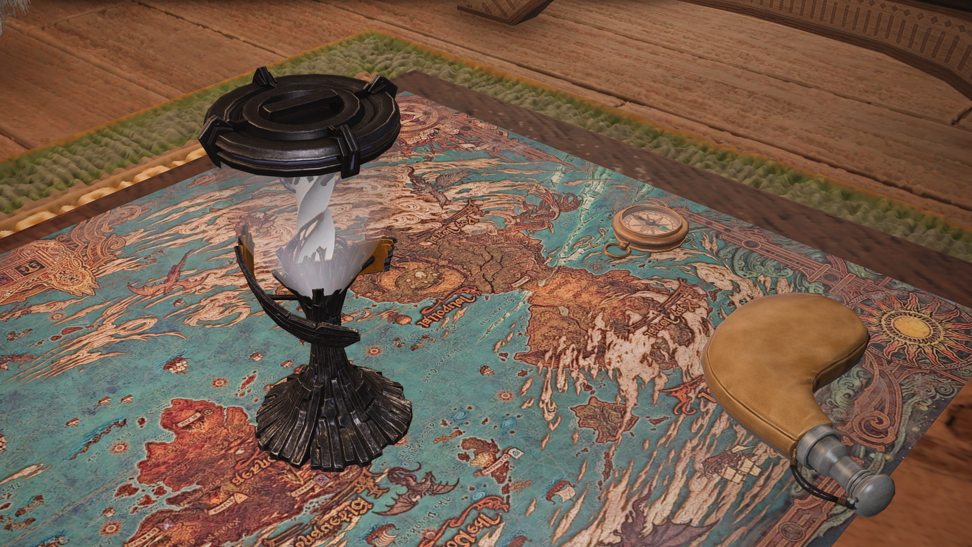 업데이트 된(?) 세계지도를 살펴보는 모험가 앞으로 찾아온 라마티와 에렌빌.